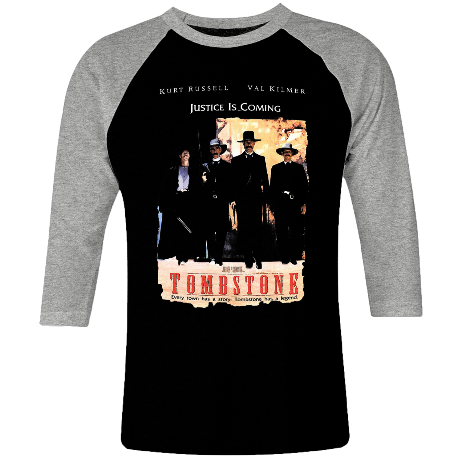 6cp I 019 Tombstone Justice Is Coming Raglan T Shirt 3 4 Sleeve 1993 Western Cult Movie Film Serie Retro Vintage Tshirts Shirt T Shirts For Men Cotton Design Handmade Logo New