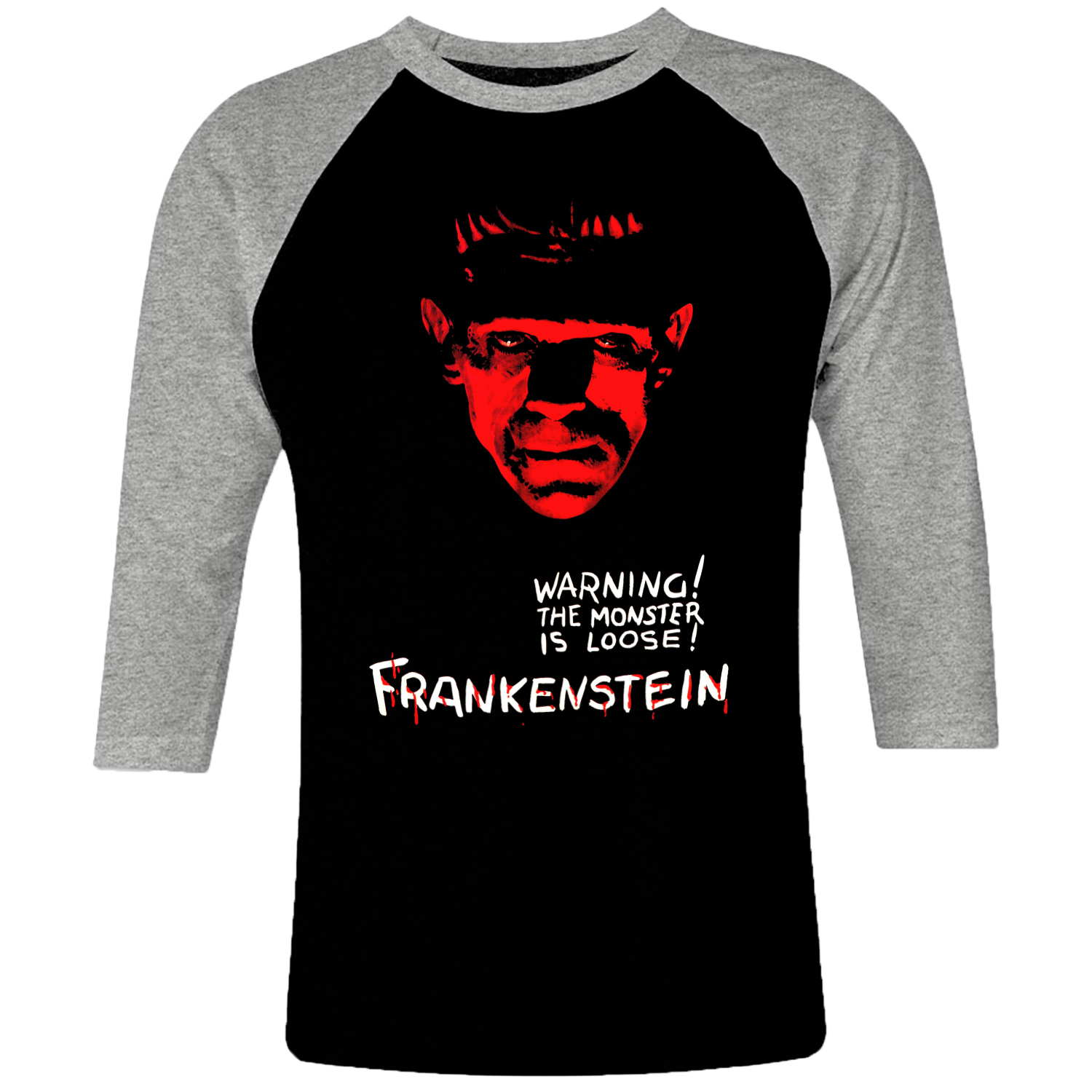 6cp I 043 Frankenstein Warning The Monster Is Loose Raglan T Shirt 3 4 Sleeve Horror Cult Movie Film Serie Retro Vintage Tshirts Shirt T Shirts For Men Cotton Design Handmade Logo New