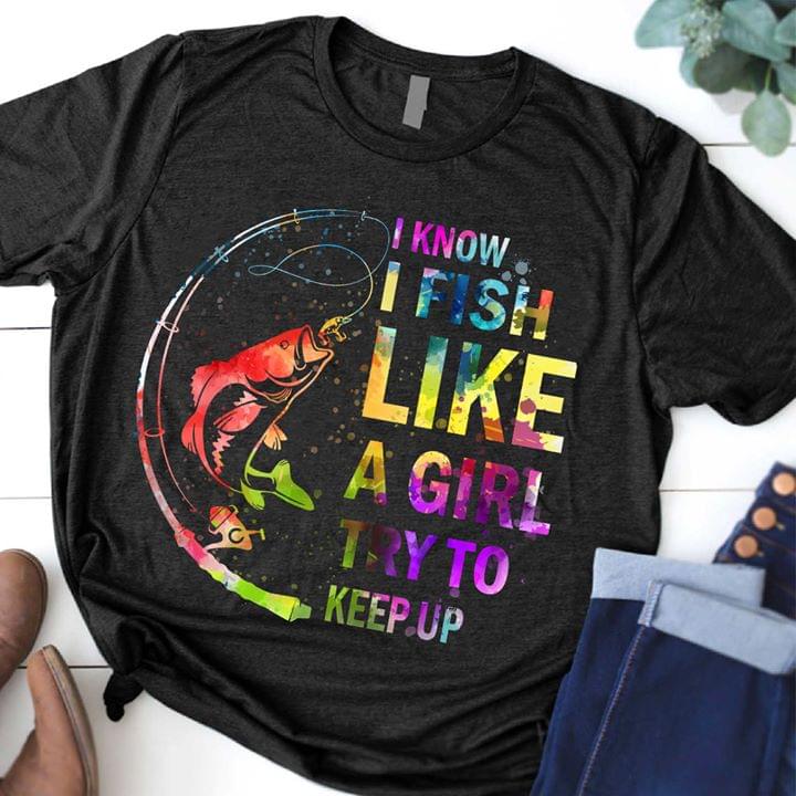 Colorful Fishing I Know I Fish Like A Girl Try To Keep Up Outdoor T-shirt Sweatshirt Hoodie