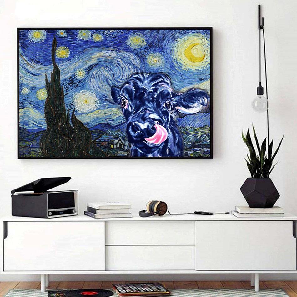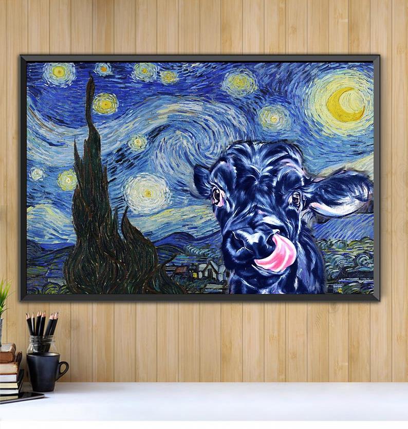 Cow Starry Night Horizontal Canvas Black Canvas