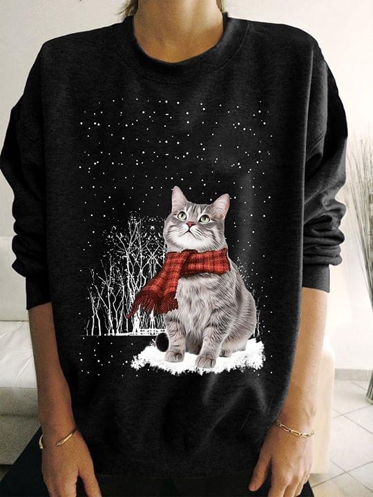 Cute Gray Scottish Cat Under Snow Christmas Shirt
